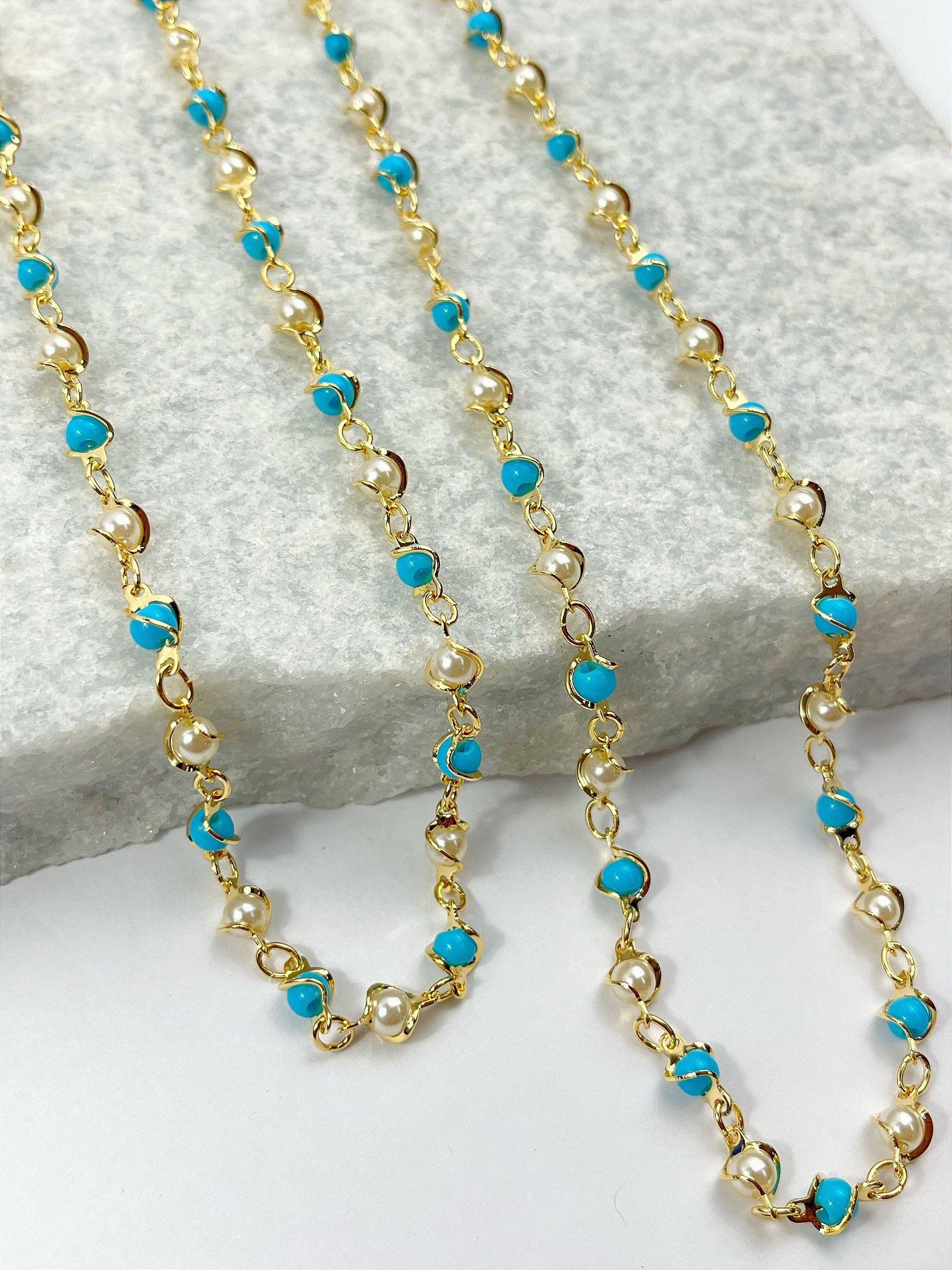Corrente Pérola com conta turquesa banho ouro 2 milésimos com verniz italiano - 1 metro