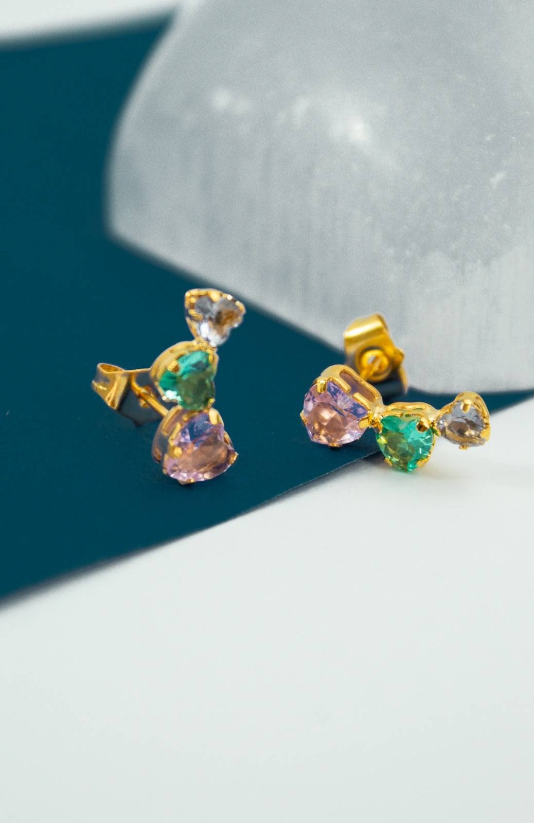 Brinco Coração Zircônia Cores verão Banho ouro 2 milésimos Verniz protetivo Com tarraxa em latão - 1 par