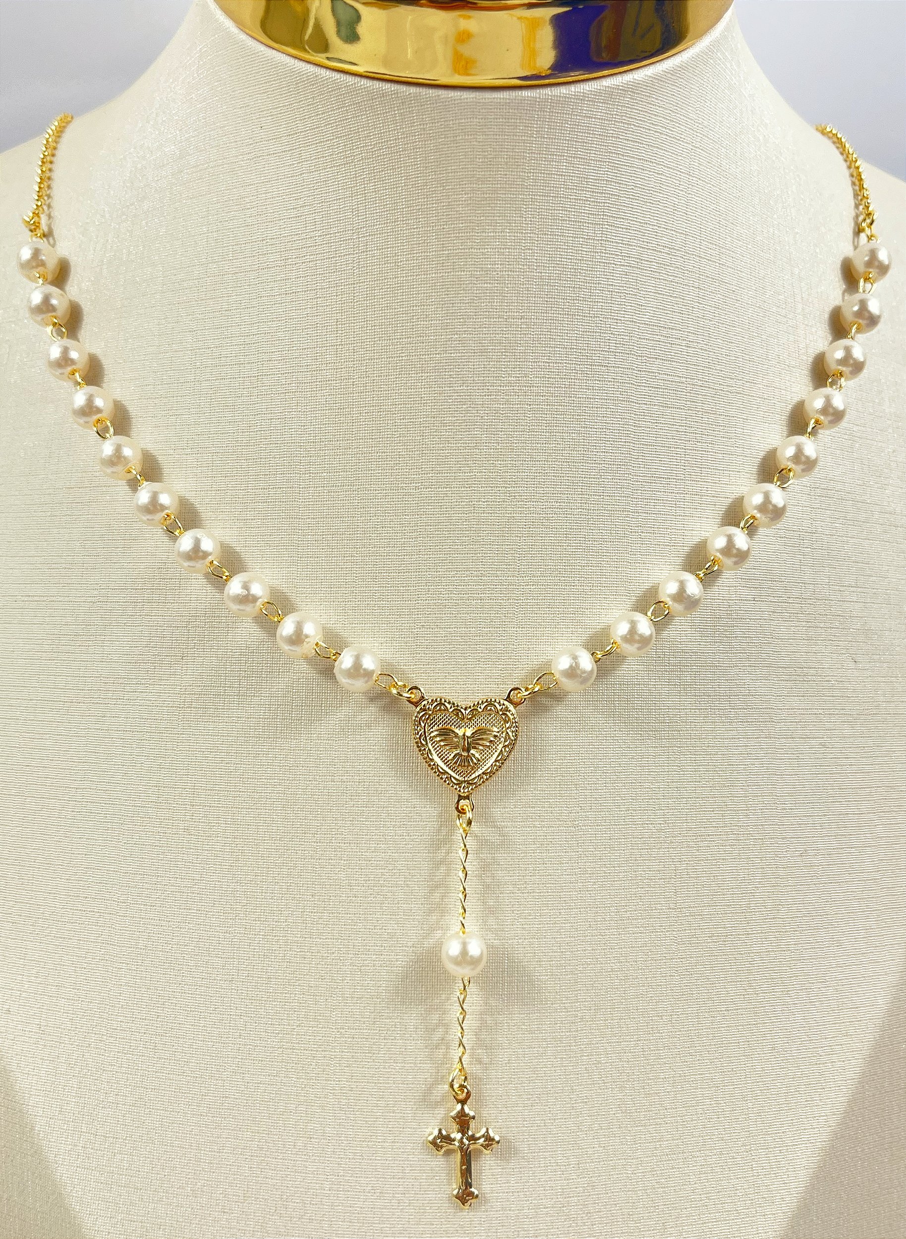 Colar Terço Espírito Santo com pérola banho Ouro 2 milésimos com verniz - 1 unidade com extensor