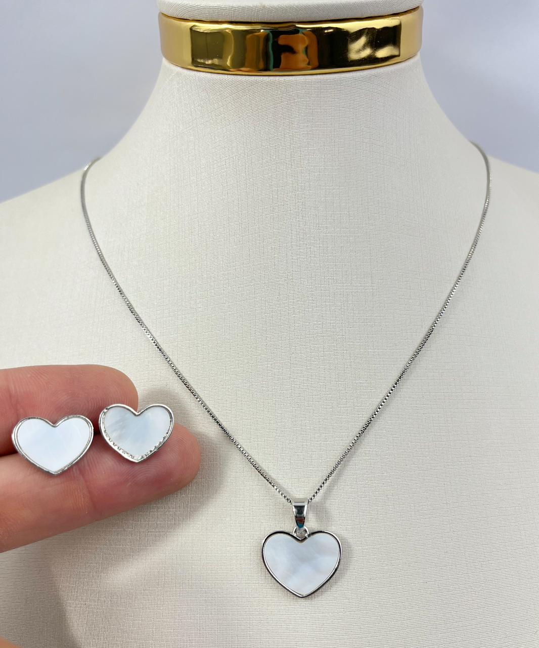 Conjunto Colar Veneziana pingente coracao com madreperola - 40cm mais extensora - banho Diamante com verniz - colar e brinco