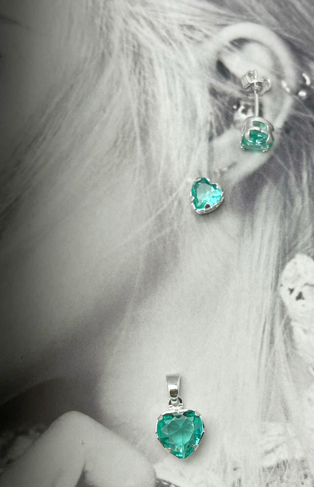 CONJUNTO PRATA CORACAO VERDE TURQUEZA - BANHO PRATA 925 COM 50 MILÉSIMOS CAMADA E VERNIZ - BRINCO E PINGENTE