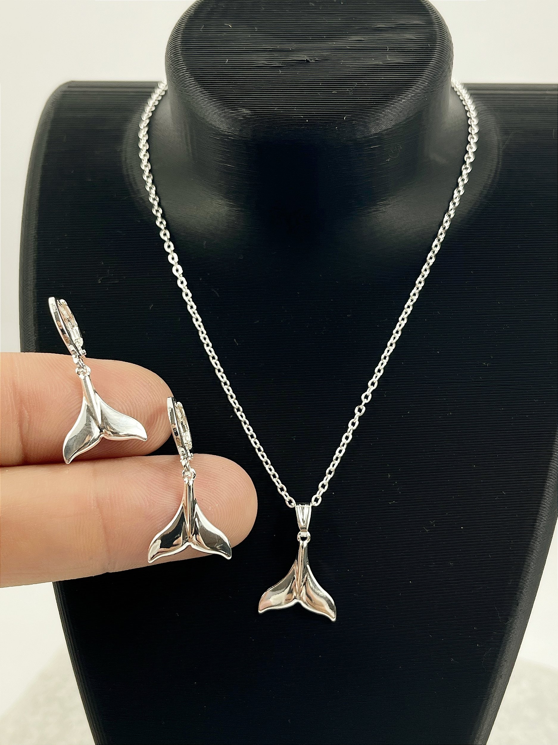 Conjunto Rabo de Baleia Colar e Brinco Tranqueta Banho Prata 925 Semijoia - 50 milésimos com verniz italiano