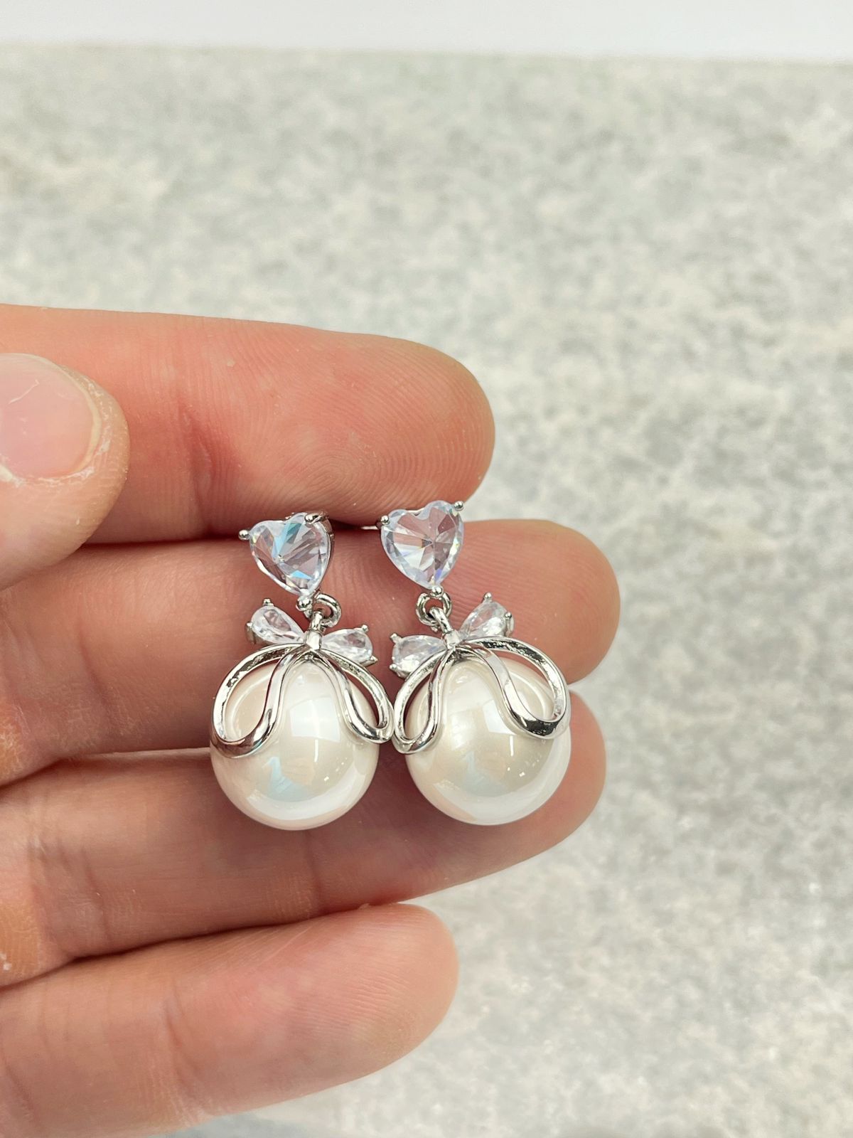 Brinco Perola com laço e coracao zirconia - banho Diamante e verniz - 1 par