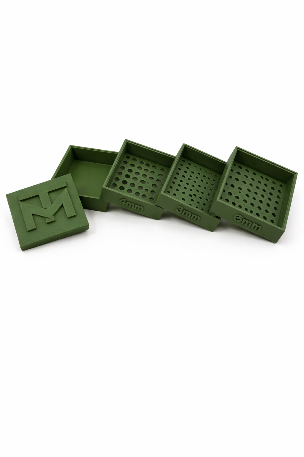 Você coloca suas peças misturadas (bolinhas, cristais, miçangas, etc.) e o sistema de furos faz a separação automática por tamanho, facilitando muito na hora da montagem.
