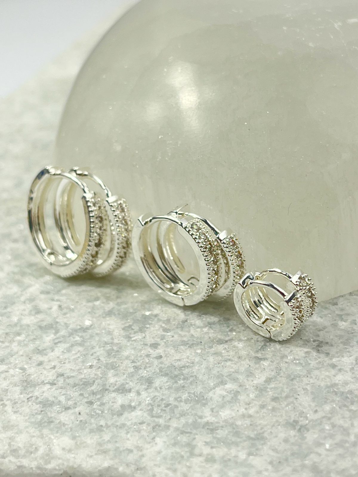 Trio Brinco Argola click Prata Cravejado com Zirconia - banho prata 925 semijoia 50 milésimos - 3 pares